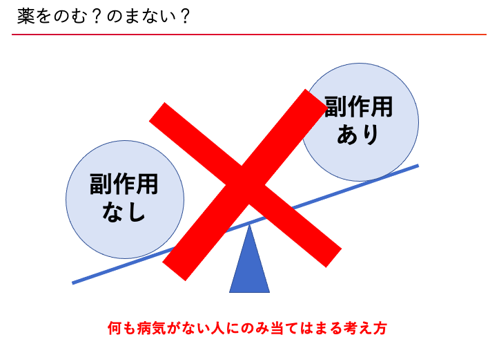 もちろん副作用についても十分に考慮しておく必要があります。それは重要です。しかし、次のような天秤を考えてはいませんか?