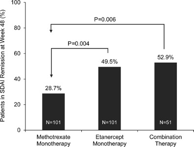 48週間後にSDAI寛解(SDAI≦3.3)を維持していたのは、下図に示されている通り、MTX単剤群(左側)で28.7%、ETN単剤群(真ん中)で49.5%、併用継続群(右側)で52.9%でした。