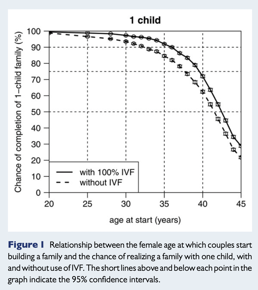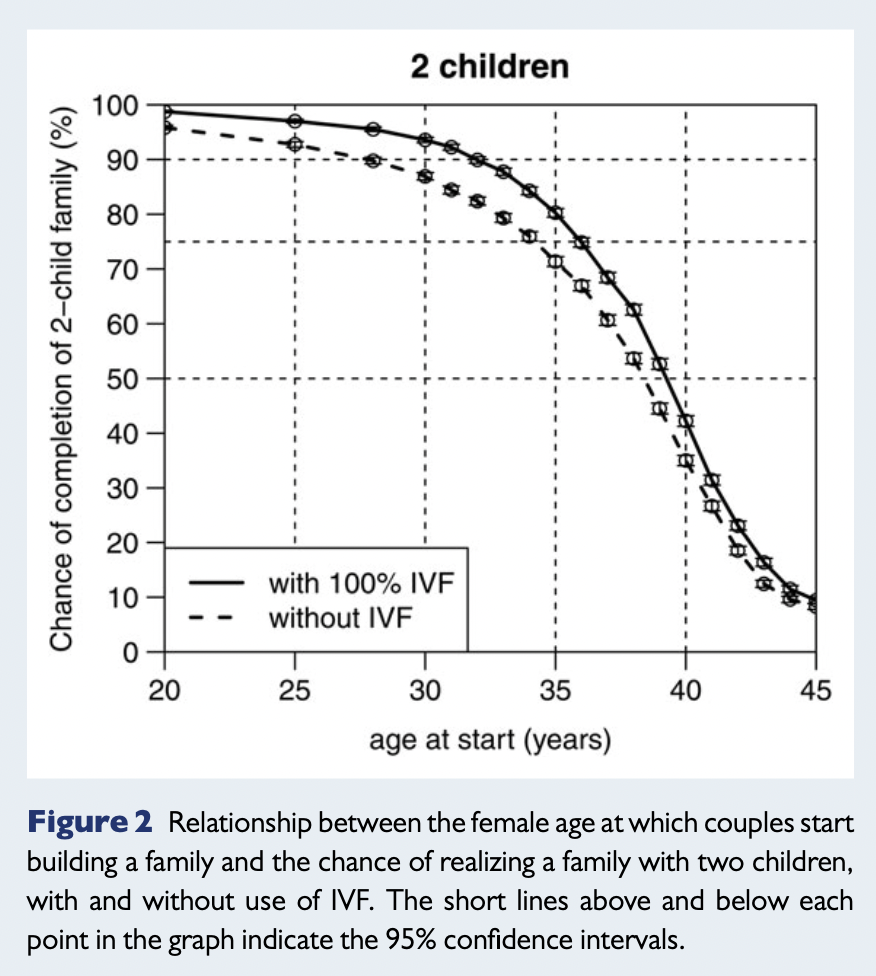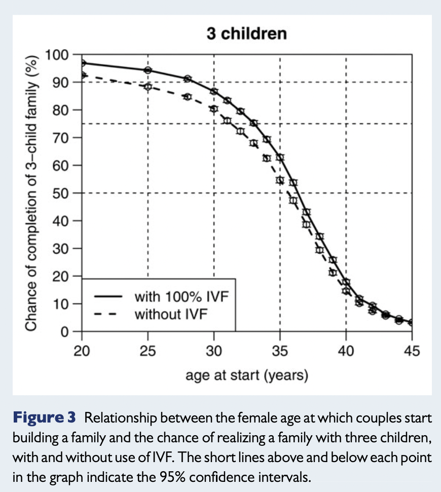 希望度が90%の場合は、縦軸の90%の点線を右の方にたどっていくと、IVFを用いない場合は32歳、IVFも用いる場合は35歳のところでグラフを交差します。つまり、IVFを用いないのであれば32歳までに妊活を始めなければいけない、IVFも用いるのであれば35歳までに妊活を始めなければ行けない、ということになります。